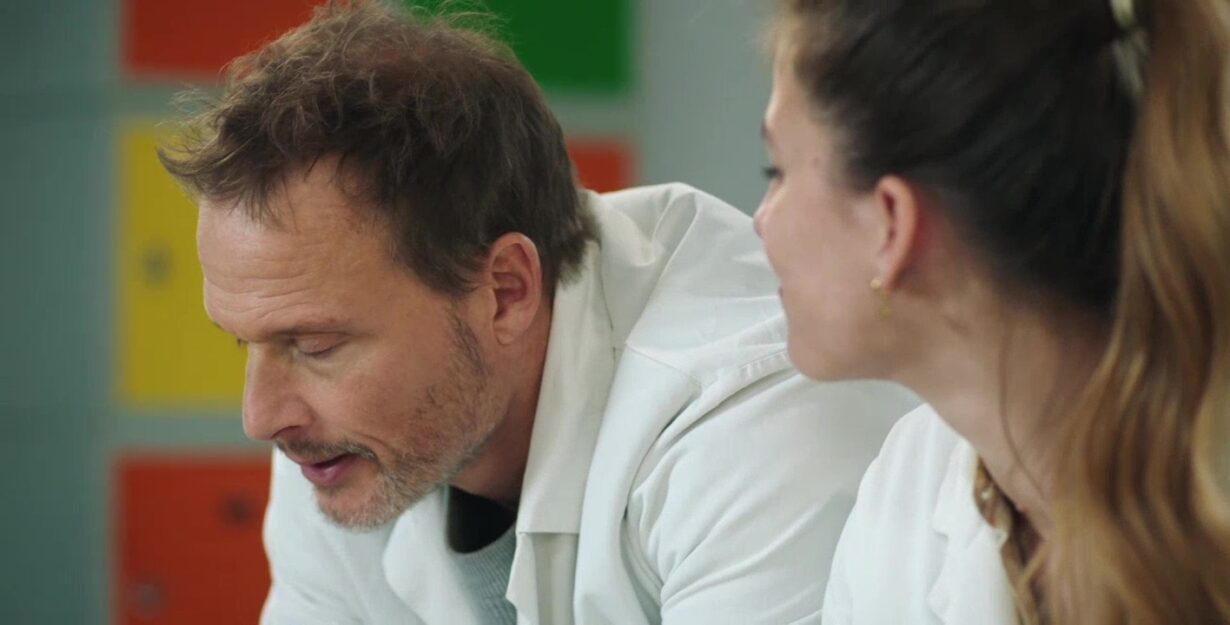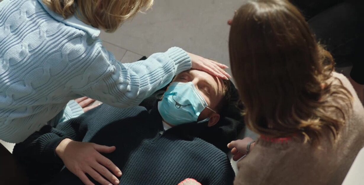 Malgré son état, Fred se présente au lycée pour assurer son cours. Il porte un masque et tente de garder contenance devant ses élèves, mais son équilibre vacille. Sa tête tourne, ses gestes se font hésitants, et il peine à rester concentré. L’effort devient trop lourd à supporter. Sous les yeux inquiets de la classe, il perd ses forces et doit s’allonger. Diane et Marceau accourent immédiatement pour l’aider et restent à ses côtés, soucieux de son bien-être.