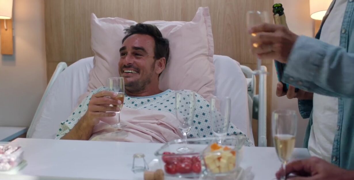 À l’hôpital, Alex, Sylvain et Marianne se rendent au chevet de Bruno. Ensemble, ils trinquent avec du vin sans alcool, dans une ambiance amicale et réconfortante. Victoire les rejoint et le petit groupe savoure ce moment de légèreté, comme une bulle d’optimisme avant l’opération de Bruno. Rendez-vous à la page suivante pour lire la suite >>