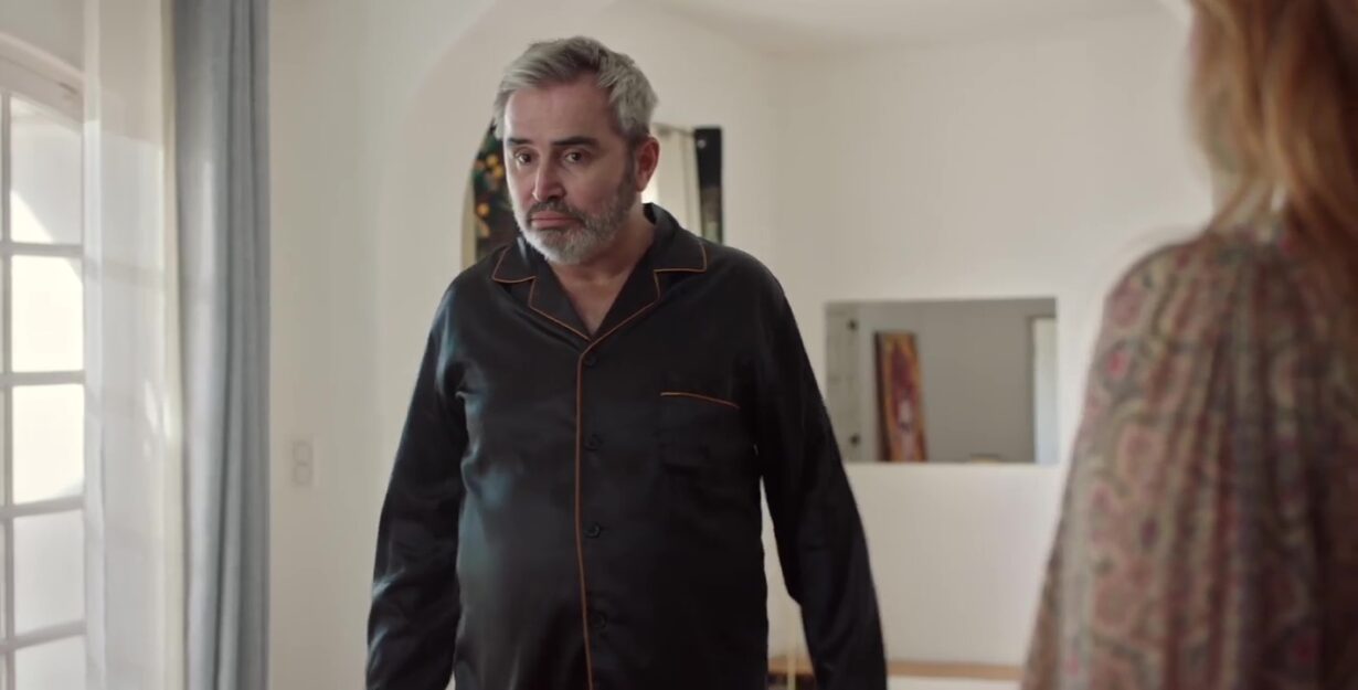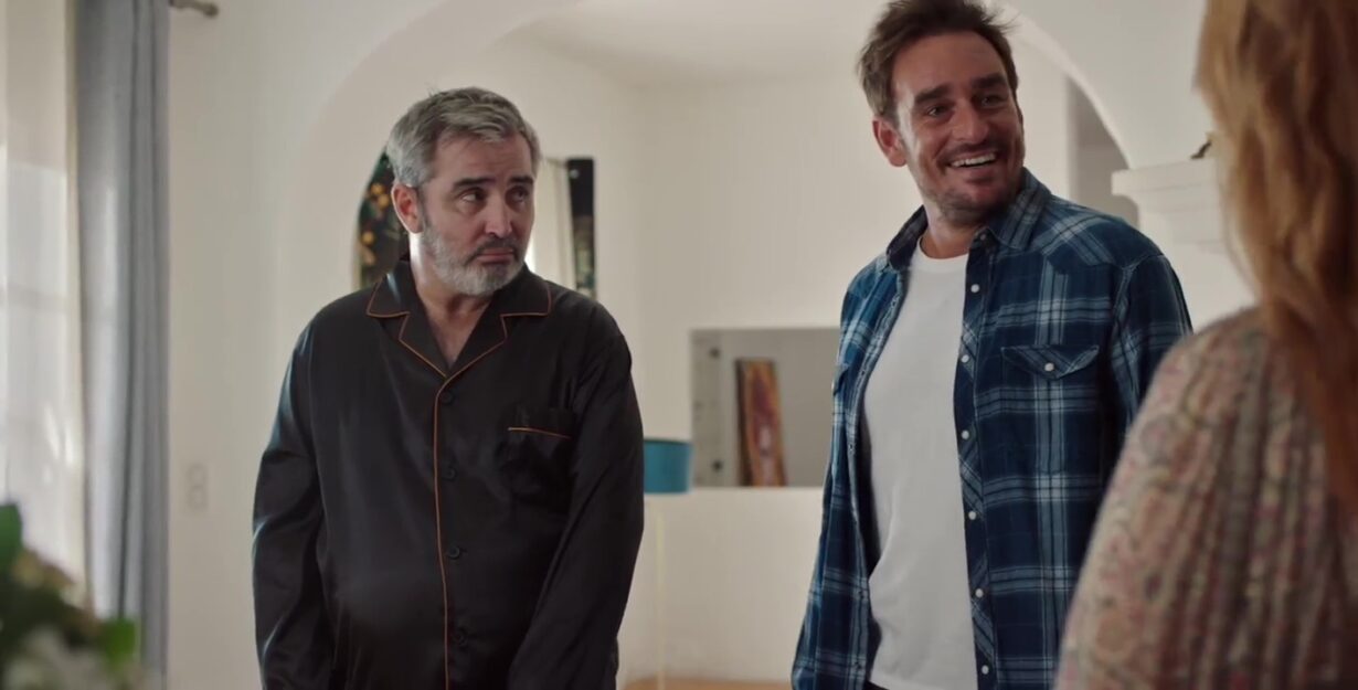 Bruno arrive alors sur place, et avec sa façon directe et sans filtre, il commente la situation. Il remarque que le prénom inscrit sur les fleurs est le même que celui de Sylvain, ce qui crée une ambiance un peu étrange. Il plaisante maladroitement en disant que la scène ressemble presque à une mise en scène commémorative complète, comme s’il manquait seulement une installation finale.