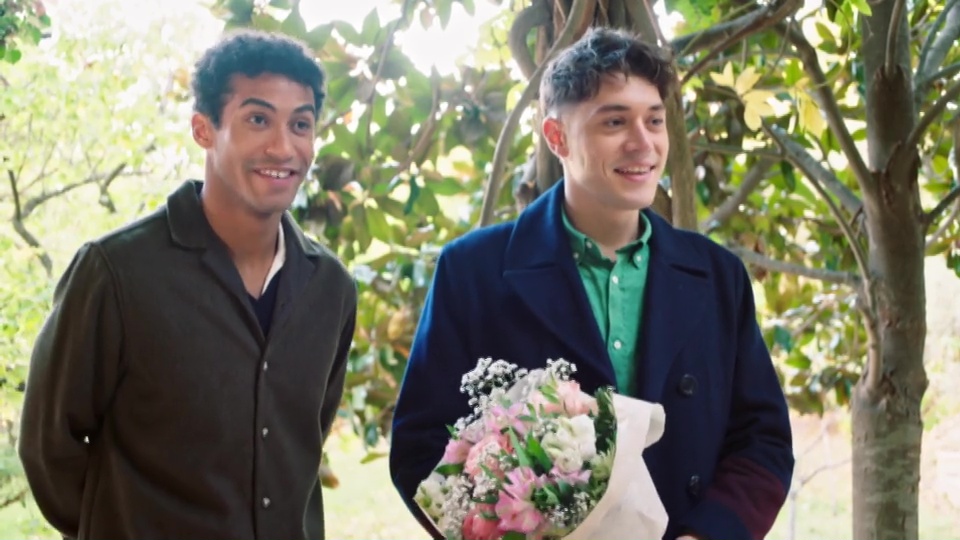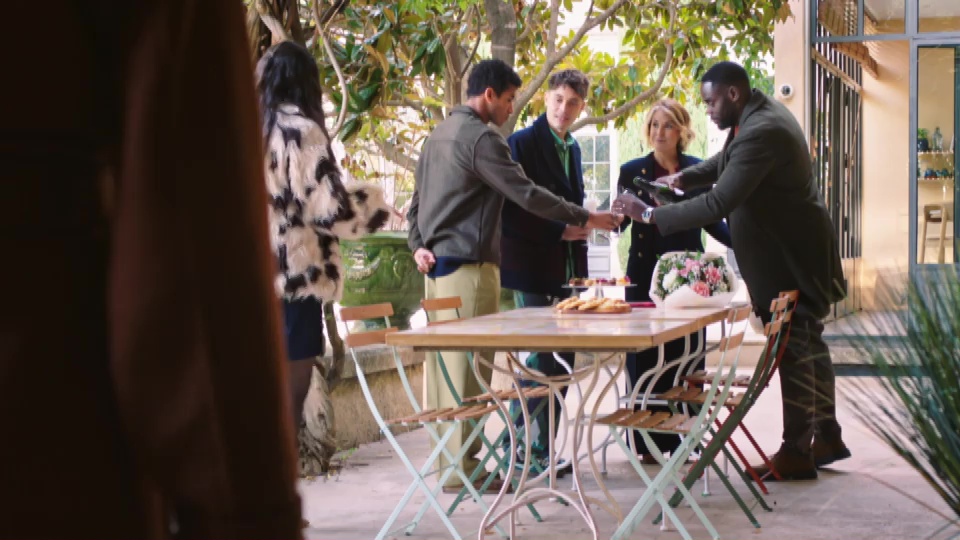 Pendant ce temps, Léonard fait la connaissance de Denis et Jeanne dans une ambiance conviviale. Il apporte un bouquet de fleurs pour marquer ce moment et tout le monde se prépare à partager un instant festif autour d’un verre de champagne.