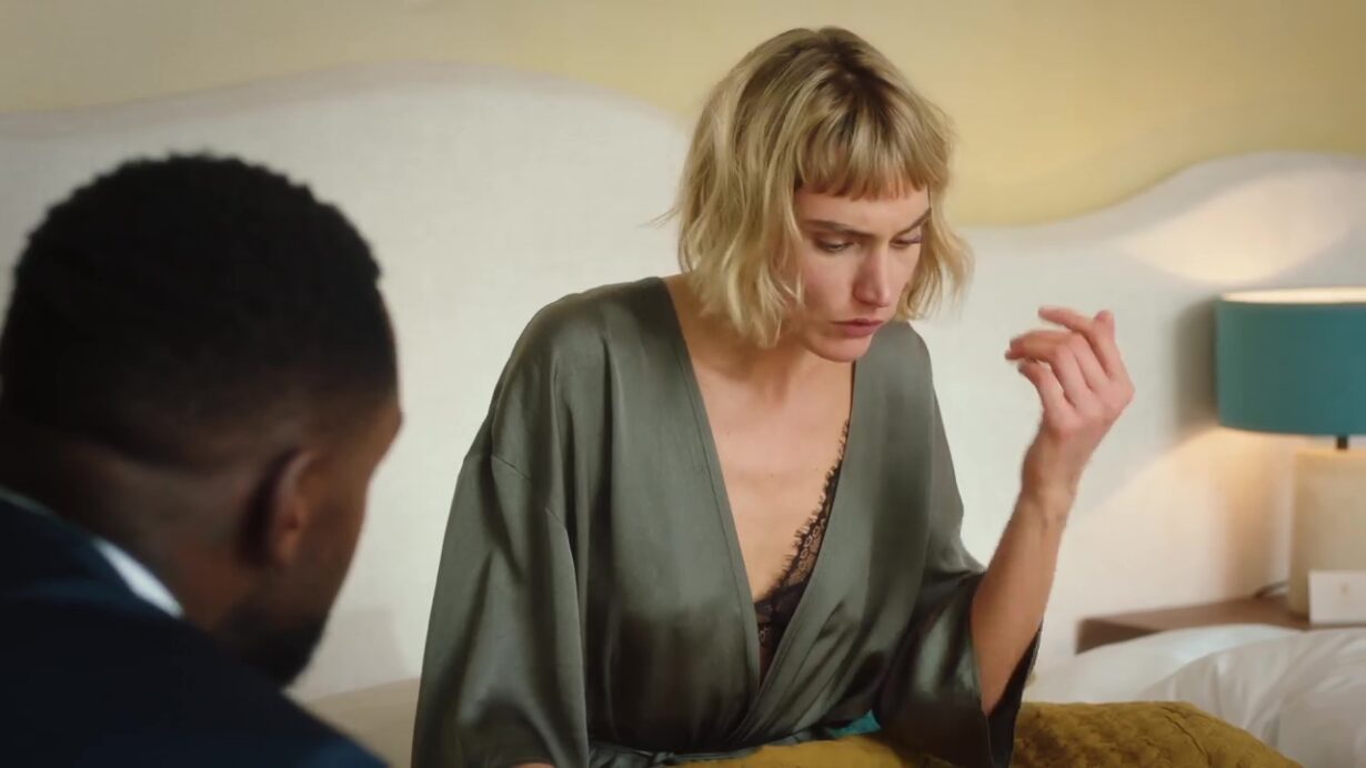 Andréa surprend Denis au moment où il quitte la chambre d’Anouk, et la scène provoque un malaise immédiat. Denis paraît embarrassé, comme s’il craignait d’être mal interprété. Il tente d’expliquer qu’il venait simplement chercher un moment de calme. Intriguée, Andréa se demande s’il ne profite pas du mini-bar, puis elle ouvre la porte et découvre Anouk en peignoir, en train d’appliquer un soin hydratant sur ses jambes. Le doute s’installe et Andréa suggère à Denis de réserver ses explications à son épouse.