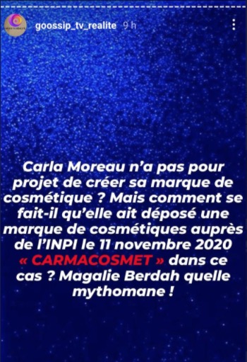 Les internautes ont relevé un mensonge de la part de Magali Berdah. Lorsque Géraldine Maillet lui demande si Carla avait pour projet de créer sa marque de cosmétiques, Magali a rétorqué que ce n’était pas à l’ordre du jour. Or selon les internautes, la marque avait bel et bien été déposée à l’INPI.