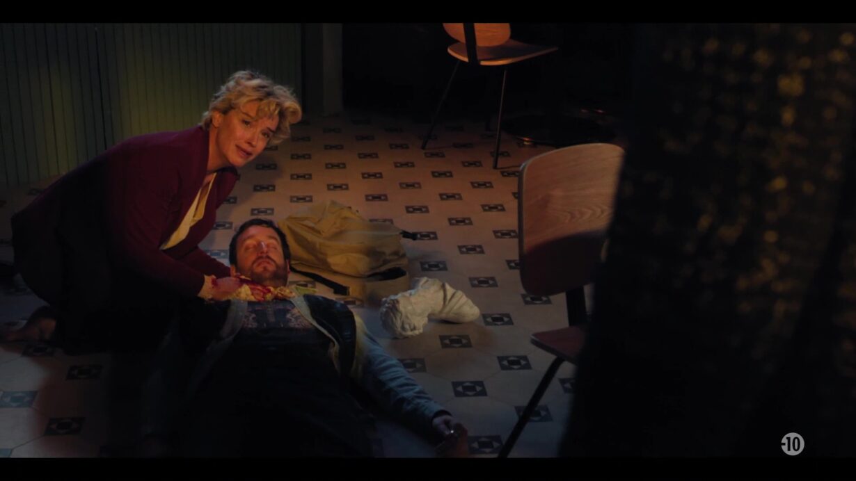La scène est chargée d’une tension palpable. Vanessa, les mains encore tremblantes, semble partagée entre la panique et la volonté d’aider. Elle explique qu’elle a découvert Ripon dans cet état et qu’elle a simplement cherché à limiter la gravité de la situation en attendant de l’aide. Son regard reflète un mélange de peur et d’incompréhension.